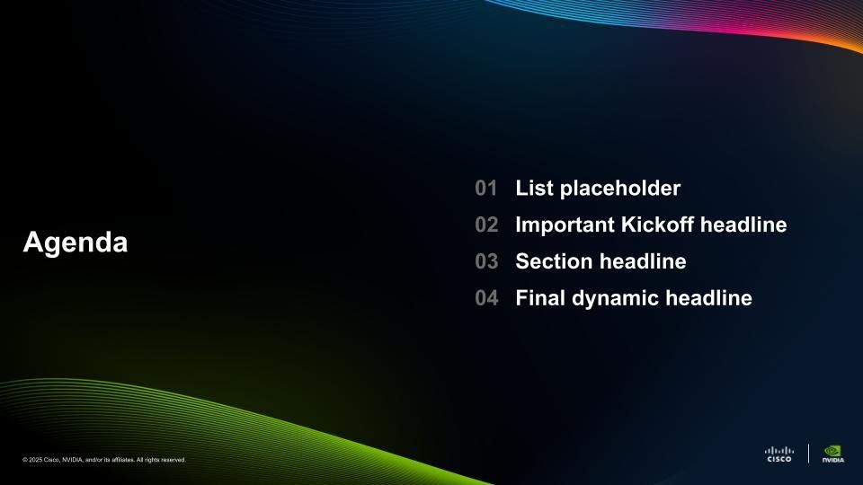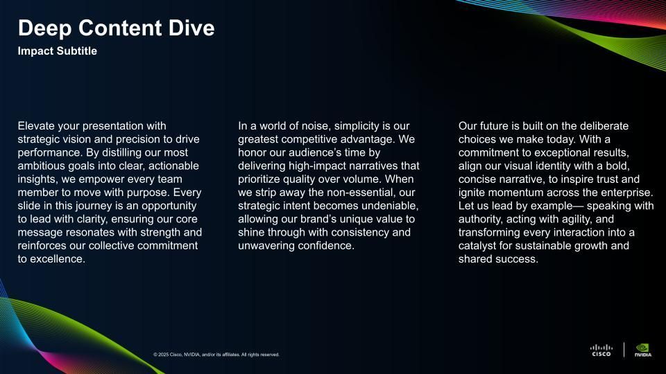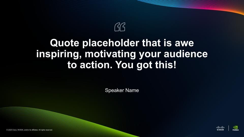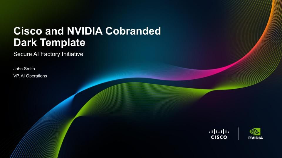 As NVIDIA and Cisco launched the Secure AI Factory initiative, the partnership required a visual system that could signal alignment, credibility, and scale from the outset. Our solution was a co-branded template system designed to balance both brand identities while presenting a unified story. Built in light and dark themes, the templates harmonized color, typography, and graphical elements without compromising either brand’s integrity. Modular components and flexible co-brand lockups allowed the system to scale seamlessly across executive keynotes, internal communications, partner presentations, and campaign materials.